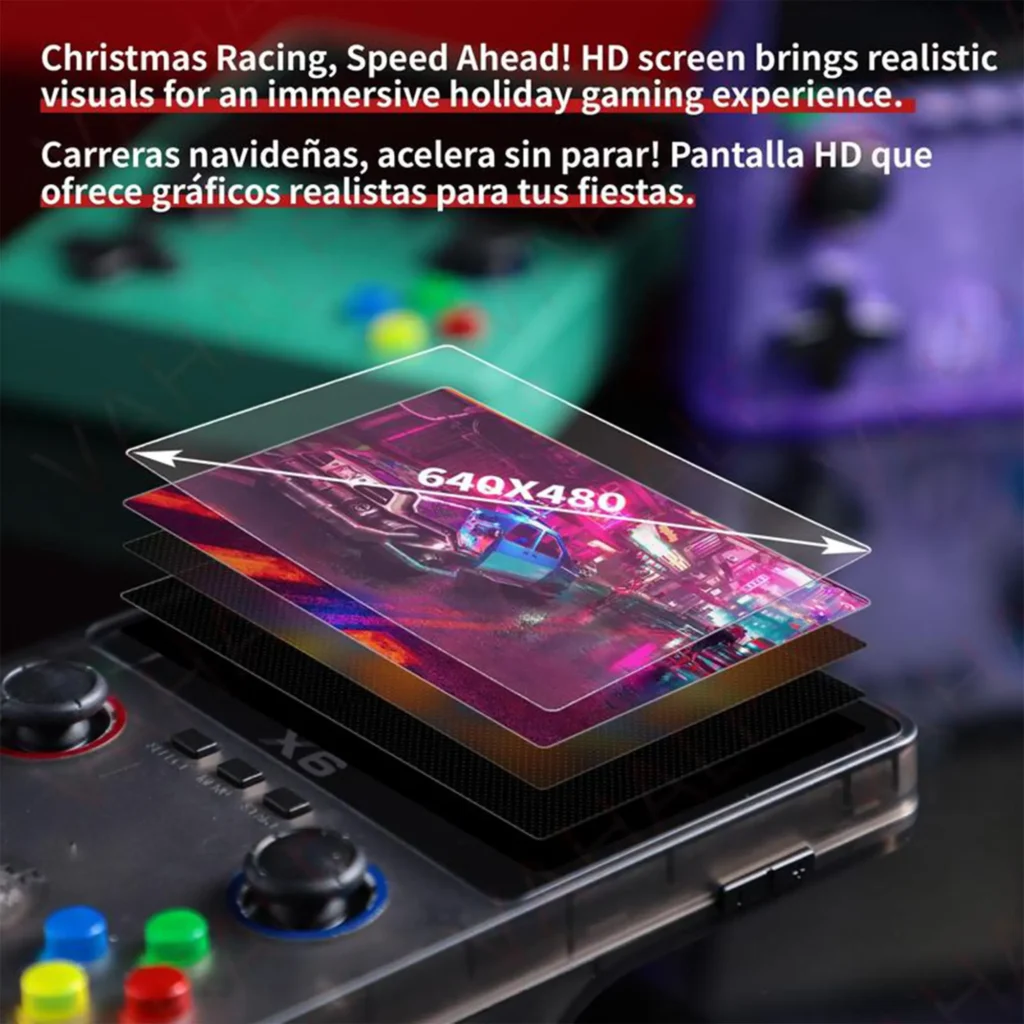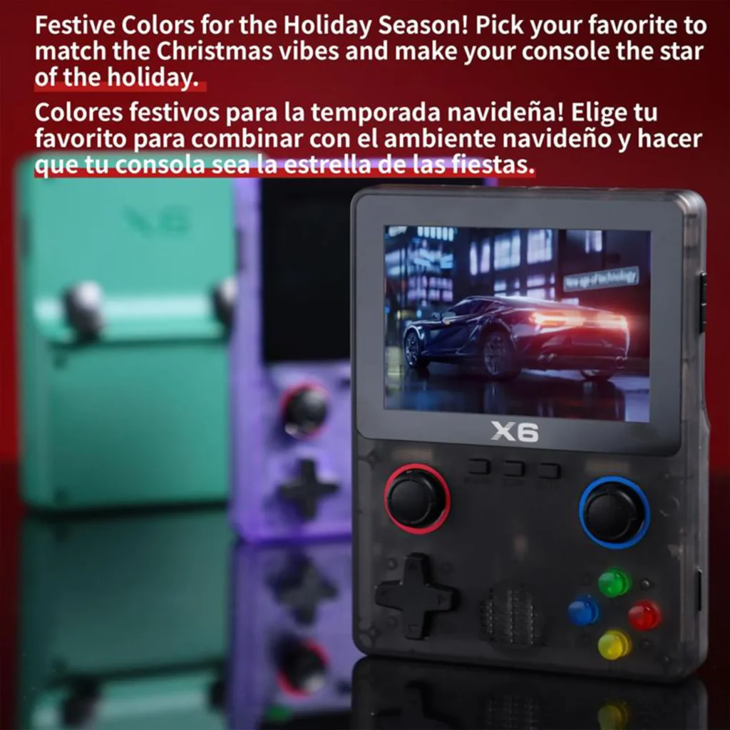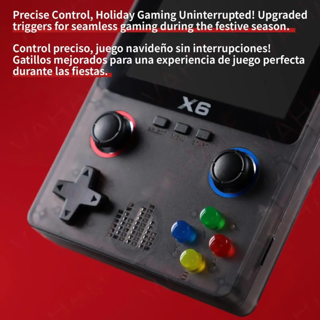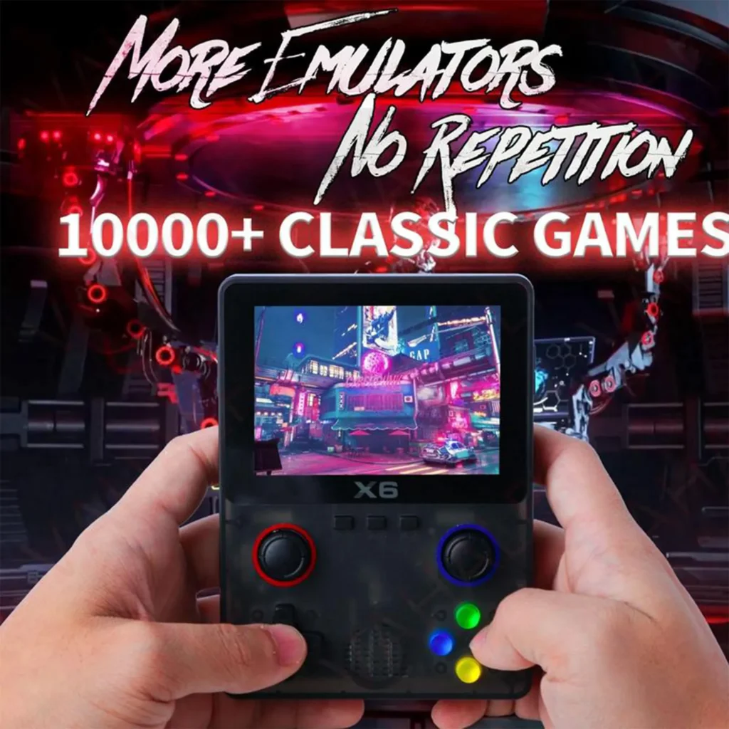 The X6 retro handheld game console features a 3.5-inch HD screen and AT12273S 32-bit processor, with a built-in 32 GB card preloaded with 10,000+ classic games. It supports over 11 emulators and most 2D games and allows for two-player gaming, controller connection, and large screen output. The 2000mAh rechargeable battery provides 3-5 hours of playtime. Lightweight and portable, perfect for travel. Also supports MP4, MP3, e-book, and other multimedia functions, making it ideal for beginners and retro game lovers.